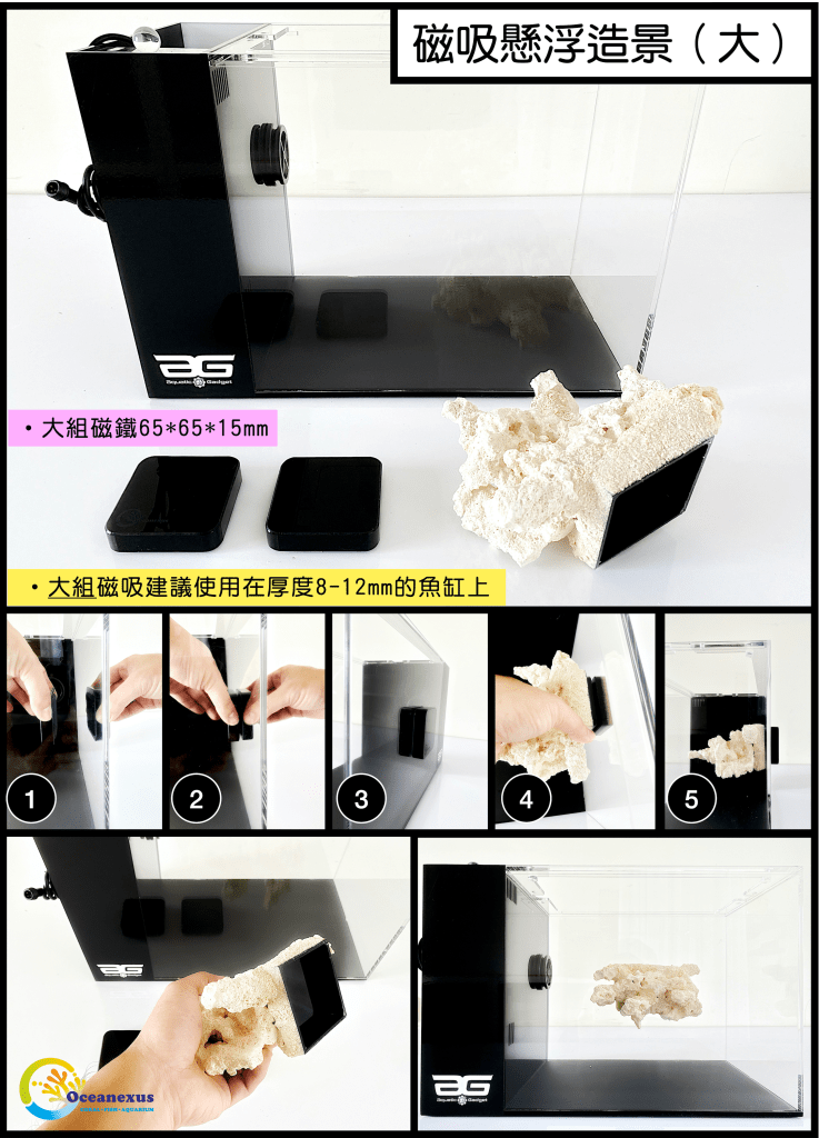 2. 大組磁鐵:建議使用在厚度8mm以上、12mm 以下的強化玻璃或壓克力魚缸。將磁鐵安裝在玻璃或壓克力時務必小心,避免 造成魚缸的損壞。
